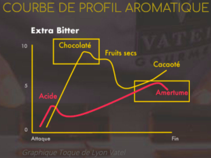 En son sein, la Toque de Lyon c’est : de la gianduja noisette lait (praliné noisette et chocolat), du chocolat au lait équatorial lactée 5,5 % et un crumble amandes et noisettes, pour un profil aromatique comme suit.