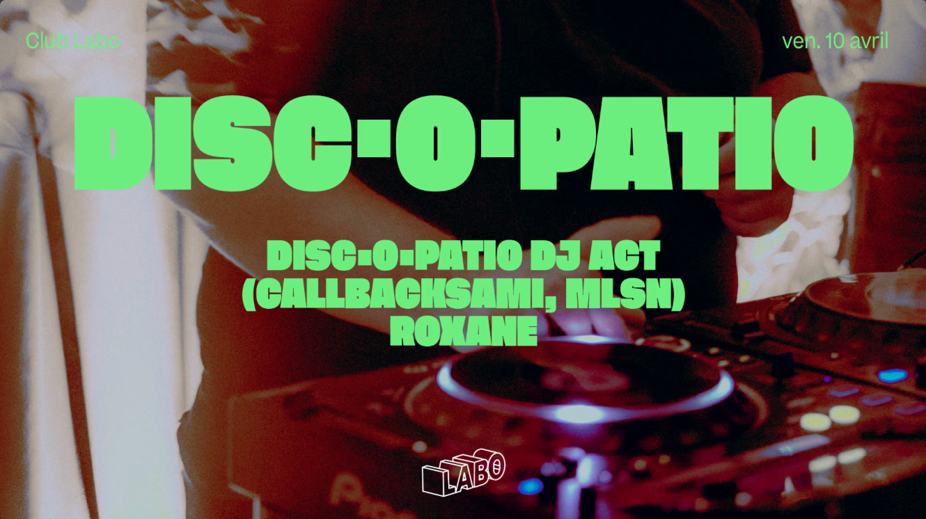 Disc·o·patio 💚 bien connu dans le paysage lyonnais, investit le Club Labo. Leurs résidents ainsi que Roxane, façonnerons un voyage sonore délicat, quelque part entre chaleur, mouvement et échappée paisible.